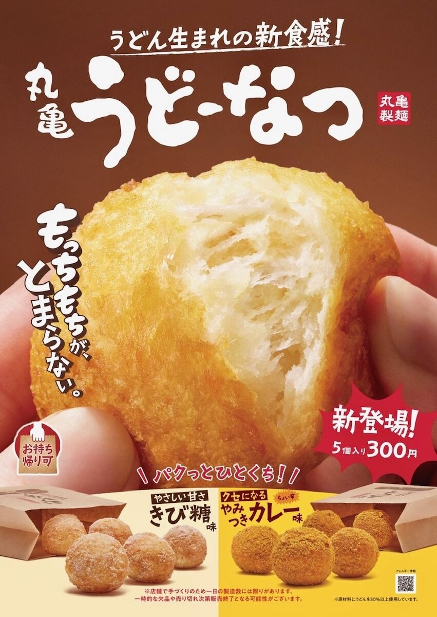 | 丸亀製麺、発売から約3か月で累計670万食「うどーなつ」、新味「焼きいも味」「ピザ味」10月2日発売 …讃岐うどん専門店「丸亀製麺」は10月2日、「丸亀うどーなつ 焼きいも味」「丸亀うどーなつ ピザ味」を発売する。各5個入り、税込300円。 全国の「… (出典:食品産業新聞社ニュースWEB) |