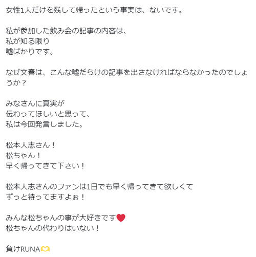 活動休止中の松本に対し「松本人志さん! 松ちゃん! 早く帰ってきて下さい! 松本人志さんのファンは1日でも早く帰ってきて欲しくてずっと待ってますよぉ! みんな松ちゃんの事が大好きです 松ちゃんの代わりはいない! 負けRUNA」と強く呼びかけた。