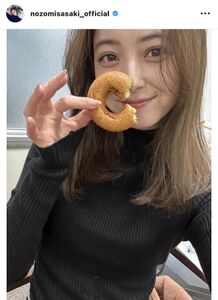 インスタグラムに「現場でドーナツを差し入れしました」とつづり、黒ニット姿でドーナツを手にした自撮りショットをアップ。